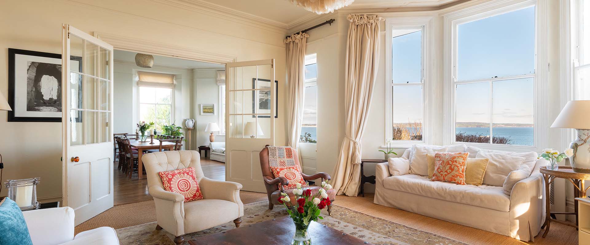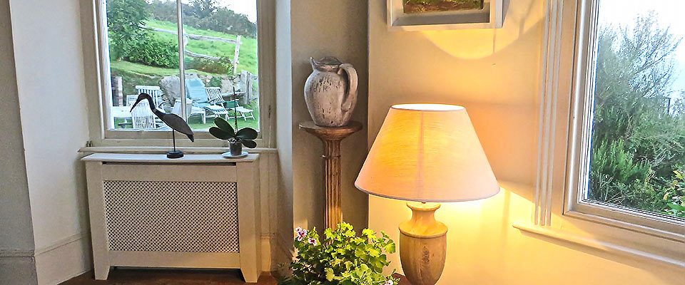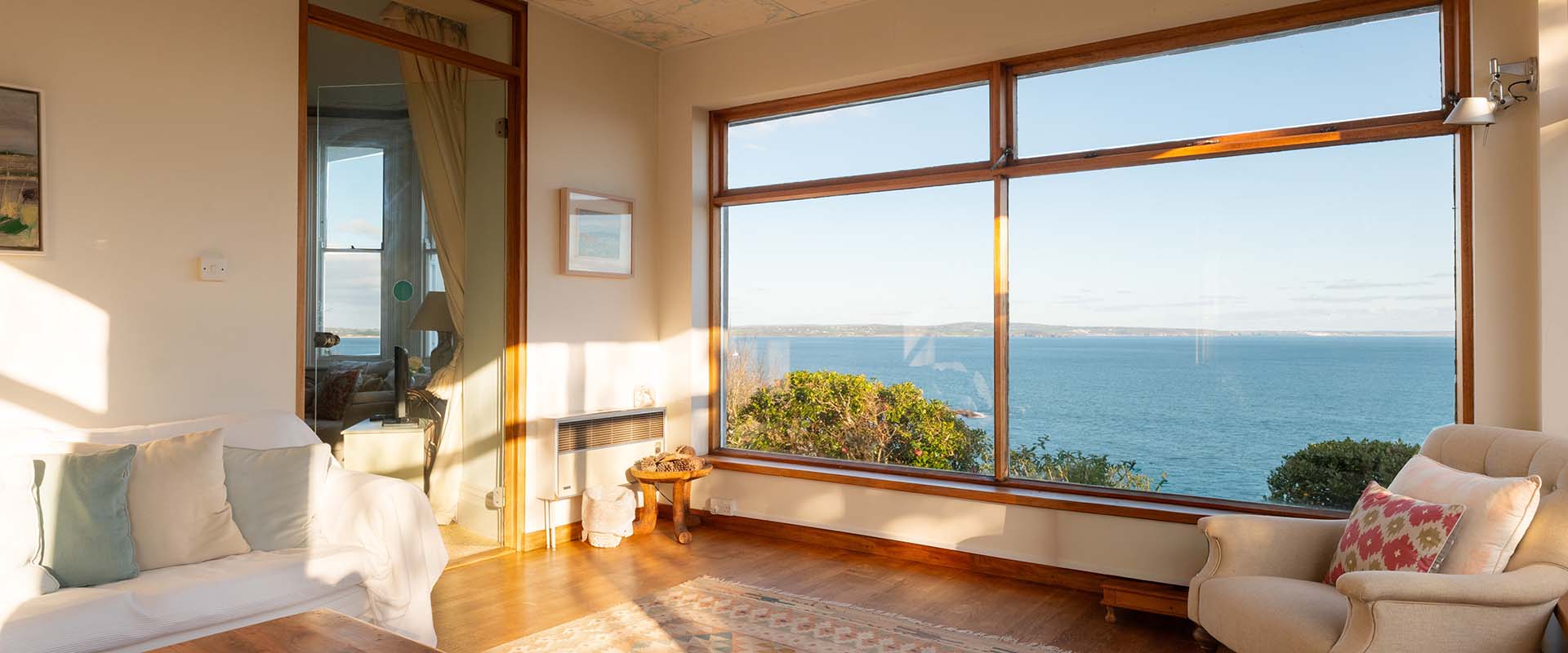 The principal rooms all have panoramic views of the Atlantic from Penzance, Mount’s Bay and the Lizard to the rocky coastline stretching west towards Lamorna and Land’s End.