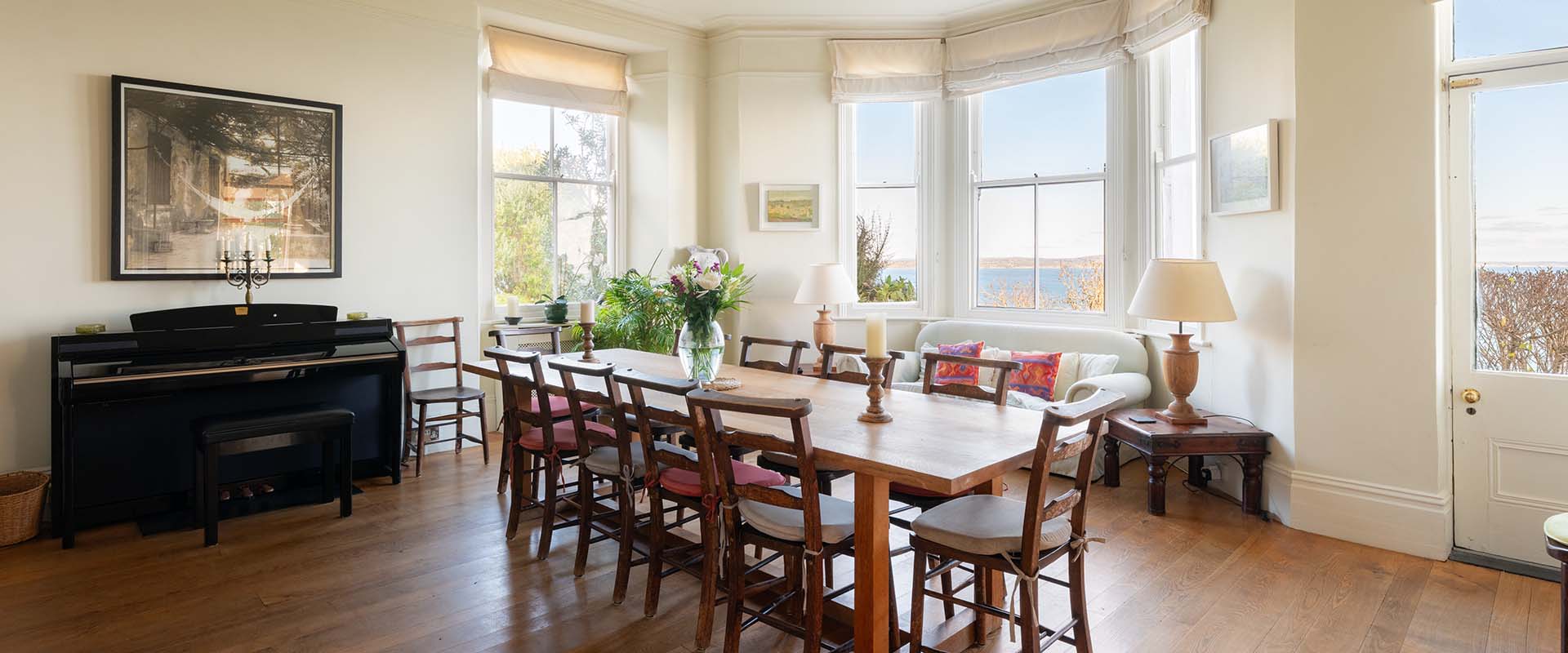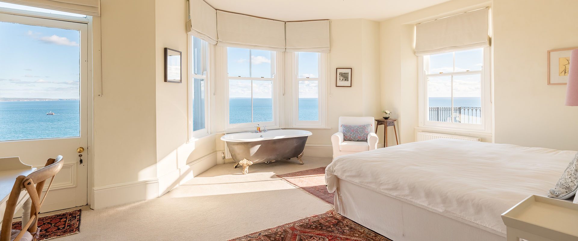 On the first floor a light airy landing, typical of a house of this period, leads to five large bedrooms, three with en-suite bathrooms, and an additional family bathroom. The two main bedrooms both have bay windows, open onto a balcony with far-reaching views over the sea, one with a Victorian enamelled bath beneath the bay window.