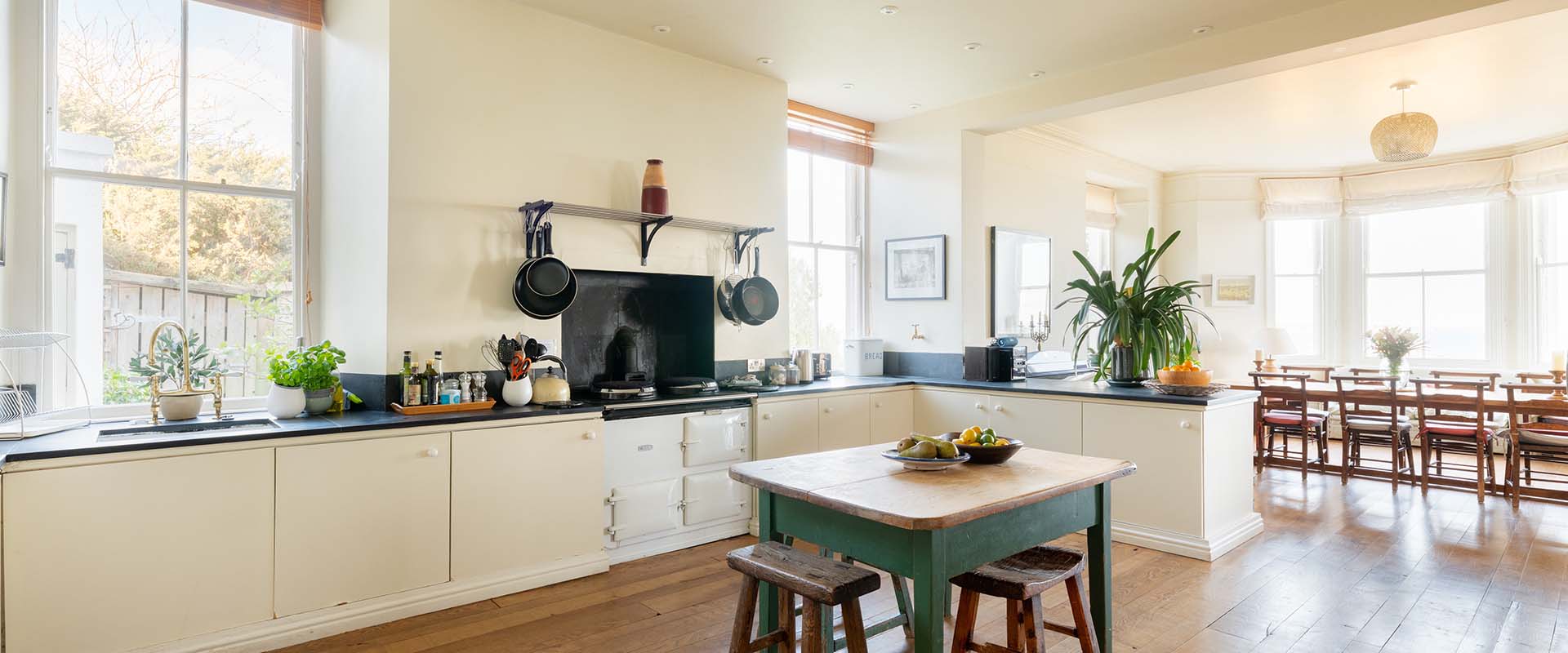 There is a large family kitchen with an Aga and Rangemaster oven, an open-plan dining room, a sitting room with a log fire and a sunroom all opening into one another creating a wonderful sense of light and space.